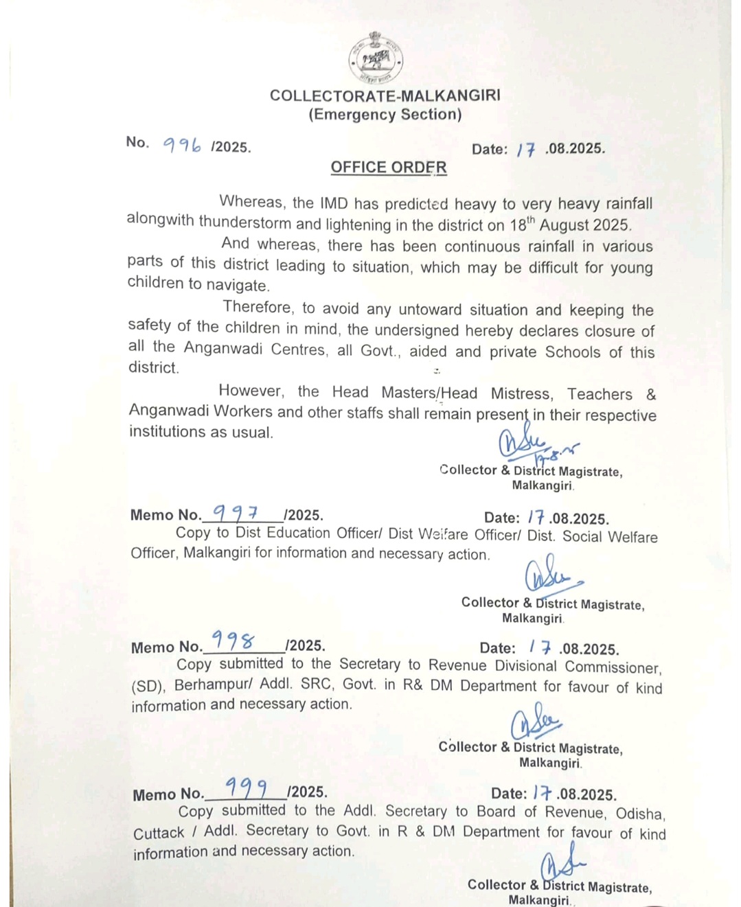 ମାଲକାନଗିରି,୧୭/୦୮ (ସୁଧାଂଶୁ ଶେଖର ମହାନ୍ତି)ମାଲକାନଗିରି ଜିଲ୍ଲାରେ ଆସନ୍ତା କାଲି ପାଣିପାଗ ବିଭାଗ ପକ୍ଷରୁ ରେଡ଼ ଆଲର୍ଟ ଜାରି କରାଯାଇଥିବା ବେଳେ ଏହାକୁ ଦୃଷ୍ଟିରେ ରଖି ମାଲକାନଗିରି ଜିଲ୍ଲାପାଳ ସୋମେଶ କୁମାର ଉପାଧ୍ୟାୟ ସମସ୍ତ ସରକାରୀ, ବେସରକାରୀ ସ୍କୁଲ ଏବଂ ଅଙ୍ଗନବାଡି କେନ୍ଦ୍ର ଛୁଟି ଘୋଷଣା କରିଛନ୍ତି। ତେବେ ପିଲାମାନେ ବାହାରକୁ ନ ବାହାରି ନିଜ ନିଜ ଘରେ ସୁରକ୍ଷିତ ରୁହନ୍ତୁ କିନ୍ତୁ ସମସ୍ତ ଶିକ୍ଷକ ଶିକ୍ଷୟିତ୍ରୀ ଏବଂ ଅଙ୍ଗନବାଡି କର୍ମୀ ନିଜ ନିଜ ବିଦ୍ୟାଳୟ ଏବଂ ଅଙ୍ଗନବାଡି କେନ୍ଦ୍ରରେ ଉପସ୍ଥିତ ରହିବା ନିମନ୍ତେ ନିର୍ଦ୍ଦେଶ ଦେଇଛନ୍ତି। ଏନେଇ ଆଜି ରାତ୍ର ୯ଟା ସମୟରେ ଏକ ଚିଠି ଜିଲ୍ଲାପାଳ ଙ୍କ କାର୍ଯ୍ୟାଳୟ ପକ୍ଷରୁ ଜାରି କରି ସୂଚନା ଦିଆଯାଇଛି।