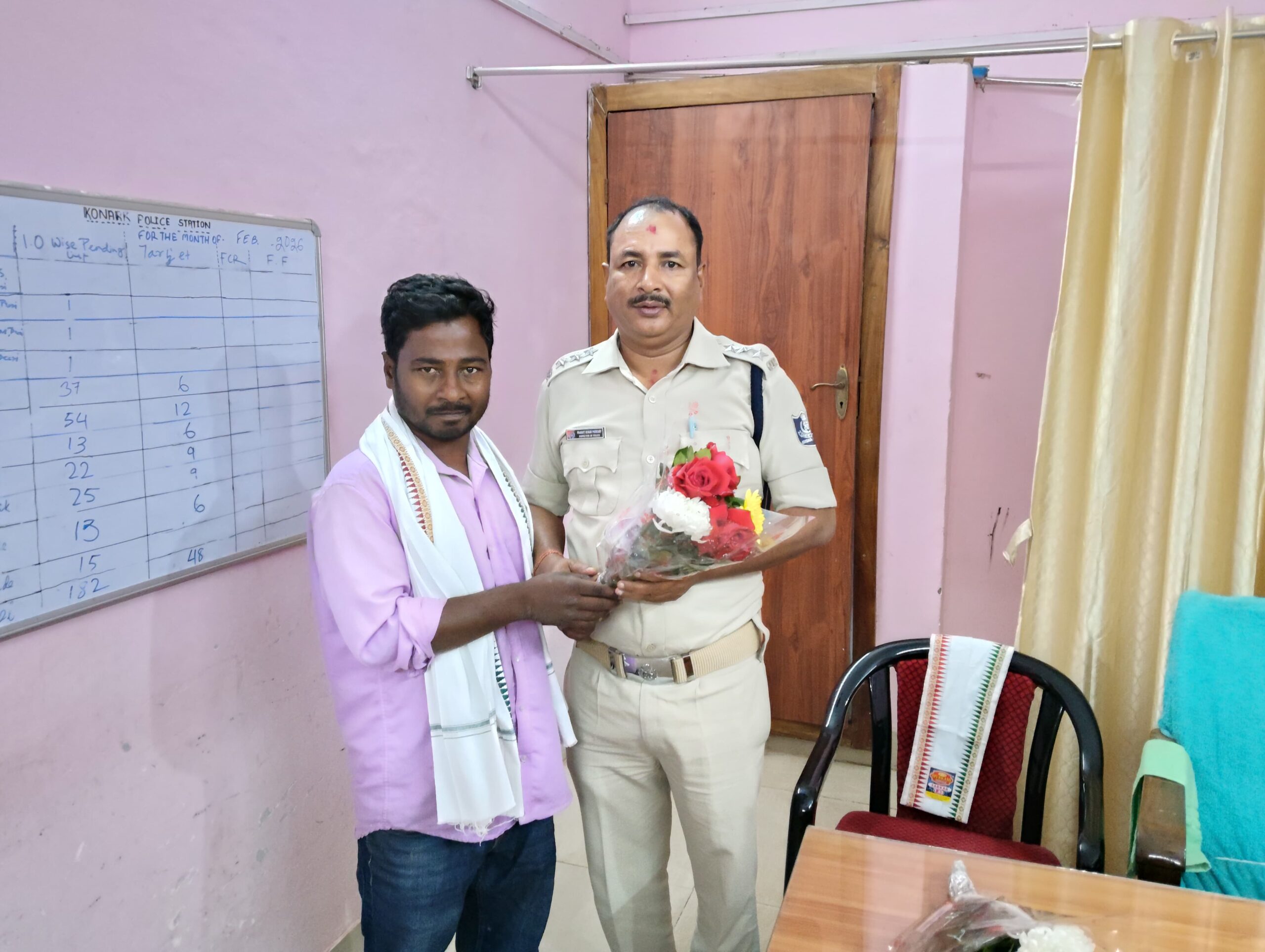 କୋଣାର୍କ, ୧୪/୦୨(ପାଇକପୁଅ) କୋଣାର୍କ ଥାନା ଭାରପ୍ରାପ୍ତ ଅଧିକାରୀ ପୂର୍ଣ୍ଣ ଚନ୍ଦ୍ର ସେଠୀଙ୍କ ପିପିଲି ଥାନାକୁ ବଦଳି ହେବା ପରେ ନୂତନ ଆଇଆଇସି ଭାବେ କୋଣାର୍କ ଥାନାରେ ପ୍ରଶାନ୍ତ କୁମାର ପଢ଼ିହାରୀ ଯୋଗଦେଇ ଅଛନ୍ତି।ଏହି ଅବସରରେ ନୂତନ ଅଧିକାରୀଙ୍କୁ ଶୁକ୍ରବାର ସନ୍ଧ୍ୟାରେ ଯୁବ ସାମ୍ବାଦିକ ଗଙ୍ଗାଧର ବେଉରା, ସାମ୍ବାଦିକ ବିଚିତ୍ର ଓଝା ପ୍ରମୁଖ ପୁଷ୍ପଗୁଚ୍ଛ ଓ ଉତ୍ତରୀୟ ଦେଇ ସମ୍ବର୍ଦ୍ଧନା ପ୍ରଦାନ ସହ ସ୍ୱାଗତ କରିଥିଲେ।କୋଣାର୍କରେ ଘଟୁଥିବା ବିଭିନ୍ନ ଅସାମାଜିକ କାର୍ଯ୍ୟକଳାପ ଉପରେ କଡା ନଜର ରଖିବା ସହ ରାତ୍ର ପେଟ୍ରୋଲିଙ୍ଗ ବ୍ୟବସ୍ଥାକୁ କଡାକଡି କରିବା ସହ ଅଞ୍ଚଳରେ ଶାନ୍ତି ଶୃଙ୍ଖଳା ବଜାୟ ରଖିବା ଉପରେ ନୂତନ ଥାନା ଅଧିକାରୀଙ୍କ ସହ ଆଲୋଚନା କରାଯାଇଥିଲା।
