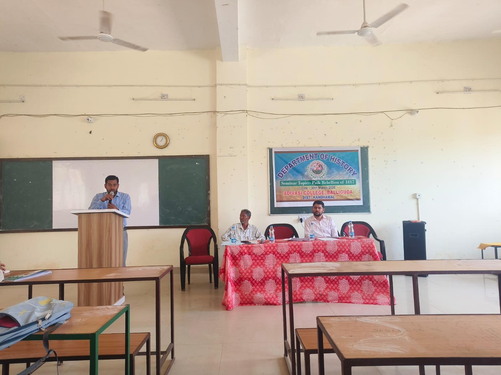 ବାଲିଗୁଡା,୩୧/୦୩(ସଞ୍ଜୟ କୁମାର ପାଣିଗ୍ରାହୀ) କନ୍ଧମାଳ ଜିଲ୍ଲା ବାଲିଗୁଡାସ୍ଥିତ ଆଦିବାସୀ ମହାବିଦ୍ୟାଳୟର ଇତିହାସ ବିଭାଗ ତରଫରୁ ଏକ ପାଠଚକ୍ର ଇତିହାସ ବିଭାଗର ମୁଖ୍ୟ ଅଧ୍ୟାପକ ବିଜେନ୍ଦ୍ର କୁମାର ବିନ୍ଧାଣୀଙ୍କ ସଭାପତିତ୍ୱରେ ମହାବିଦ୍ୟାଳୟ ପରିସରରେ ଅନୁଷ୍ଠିତ ହୋଇଯାଇଛି। ଏଥିରେ ବିଷୟ ବସ୍ତୁଥିଲା ” ୧୮୧୭ର ପାଇକ ବିଦ୍ରୋହ “। ବିଭାଗୀୟ ଅଧ୍ୟାପକ ମାନସ ରଞ୍ଜନ ପ୍ରଧାନଙ୍କ ତତ୍ତ୍ୱାବଧାନତାରେ ବିଭାଗର ତୃତୀୟ ବର୍ଷର ଛାତ୍ର ବିଶ୍ଵ ମୋହନ ମଲ୍ଲିକ ଓ ଛାତ୍ରୀ ବିଷ୍ଣୁପ୍ରିୟା ମଲ୍ଲିକ ଏହି ସମ୍ବନ୍ଧରେ ପାଠ କରିଥିଲେ। ଆନ୍ତରିକ ଗୁଣବାର୍ତ୍ତା ସଂଯୋଜକ ହିମାଂଶୁ ଶେଖର ସାହୁ ଯୋଗଦେଇ ଛାତ୍ର ଛାତ୍ରୀ ମାନଙ୍କୁ ଉତ୍ସାହିତ କରିଥିଲେ। ଶେଷରେ ପଦ୍ମଲୋଚନ ସାହୁ ଧନ୍ୟବାଦ ଅର୍ପଣ କରିଥିଲେ।